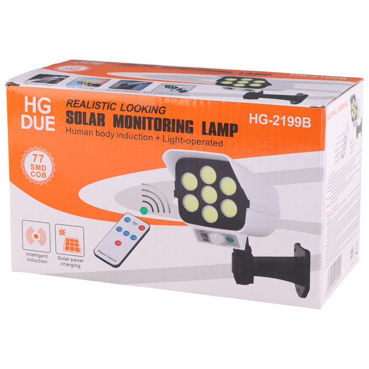 لازم به ذکر است که چراغ سنسور دار خورشیدی مدل 2199B از گواهینامه IP65 بهره می برد و در برابر نفوذ آب مقاوم می باشد. چراغ سنسور دار خورشیدی مدل COB در قسمت بالایی خود از یک پنل خورشیدی بهره می برد که برای شارژ چراغ کاربرد خواهد داشت و می تواند با ذخیره انرژی دریافتی در روز، کارایی این وسیله را افزایش دهد. چراغ خورشیدی طرح دوربین مدل HG-2199B دارای 7 عدد ال ای دی گرد COB می باشد که در ۳ حالت نور دهی متفاوت قابل تنظیم می باشند.