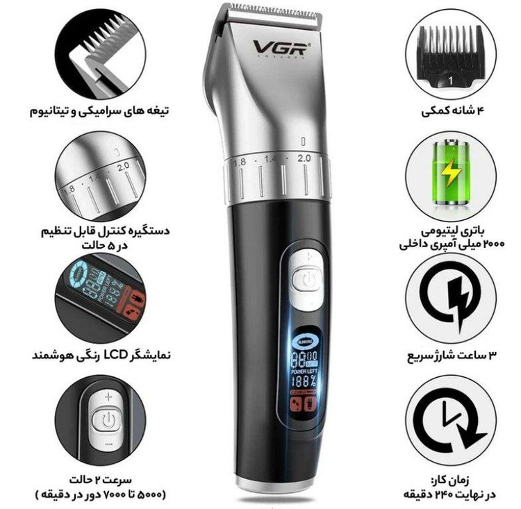 منبع انرژی باتری، جنس تیغه تیتانیوم، وزن 500 گرم، مدت زمان شارژ 2 ساعت، برند VGR میباشند.