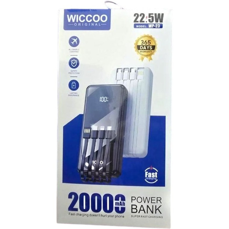 پاوربانک ویکو مدل Wiccoo WP-23 یک دستگاه 20000 میلیآمپر ساعتی با نمایشگر دیجیتال پیشرفته است که از فناوری شارژ سریع QC3.0 پشتیبانی میکند.